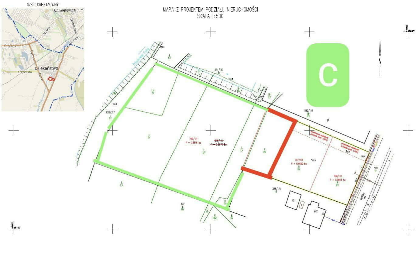 Działka C - 44,16 arów- cena ofertowa 365.000 zł - obejmuje część przeznaczoną pod zabudowę mieszkaniową o obszarze (5,46 arów) oraz obszar zielony z licznymi dzikimi nasadzeniami drzew i krzewów granicząca z pobliską rzeczką Prószkówka (pow.ok.38,70 arów) co jest niewątpliwym "haczykiem" dla miłośników wędkowania.
